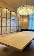 This dining table combines a solid travertine top with a burl wood base, offering a clean, natural look with a touch of character. The light stone surface pairs well with the rich wood grain, creating a warm, balanced design. Functional and stylish, it works well in both modern and classic spaces.